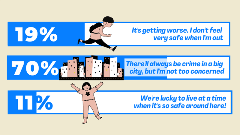 The majority of people accept a degree of crime as part of urban life, although it's sad that 19% of respondents actually feel less safe today. Only 11% say we're lucky how safe it is, even though life in Camden just a few decades back would have been statistically far more crime-ridden. Stats aside, if people don't feel safe then there's still much room for improvement.